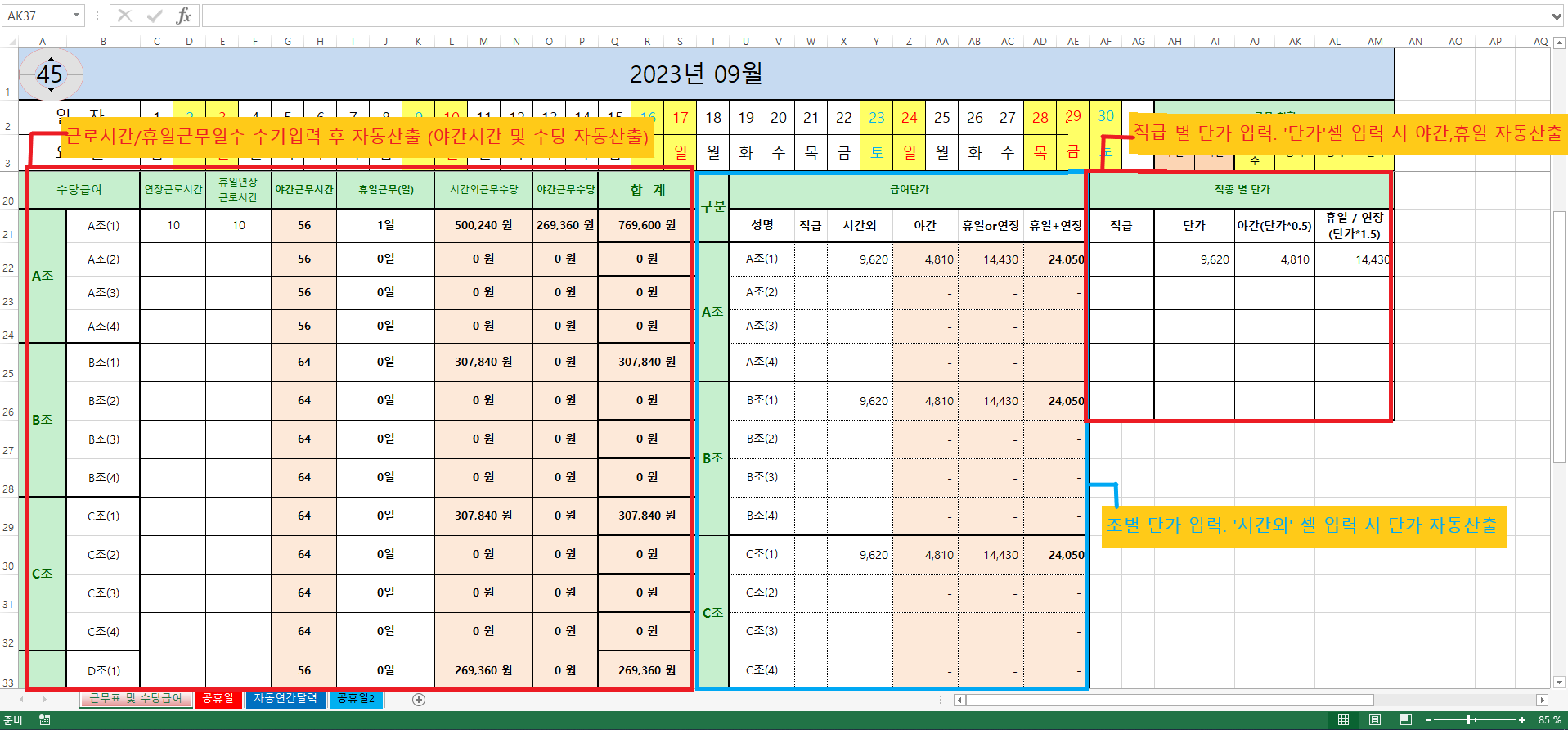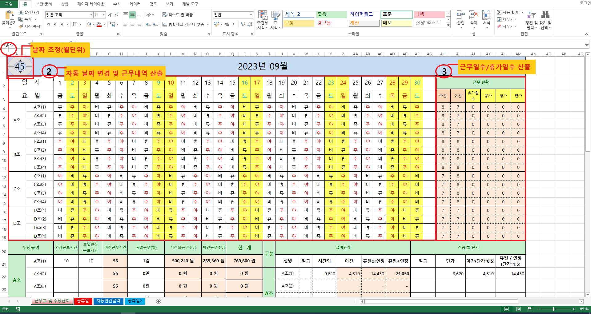 1번 워크시트에선 월별 근무표를 확인하며 초과근로시간 / 휴일 / 휴가 / 해당 조건으로 산출된 수당급여를 관리할 수 있습니다.
