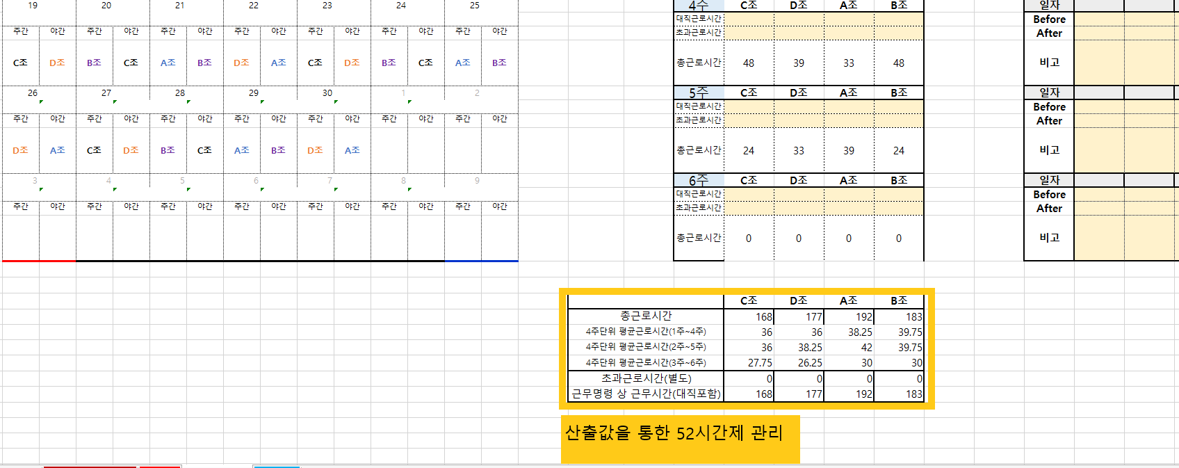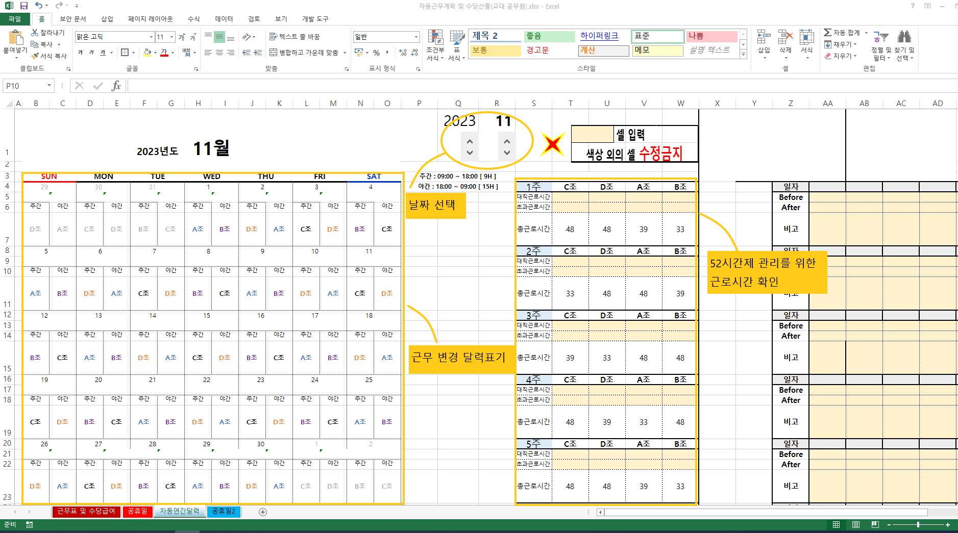 3번 워크시트에선 달력으로 근무표를 확인할 수 있으며 52시간제 적용에 따른 근로시간 관리를 할 수 있습니다.