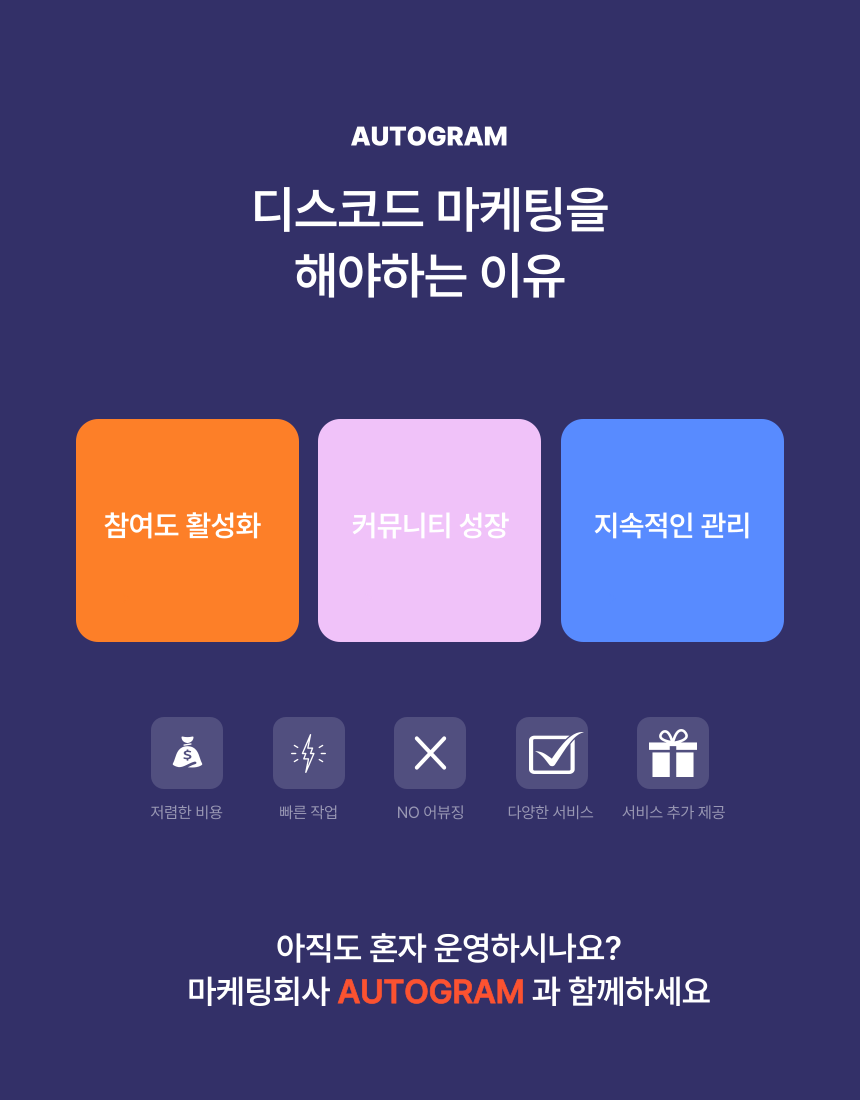 저는 Autogram을 통해 귀하의 디스코드 서버를 단순한 온라인 공간이 아닌, 활기찬 커뮤니티로 변모시키기 위해 여러분과 함께 할 준비가 되어 있습니다.