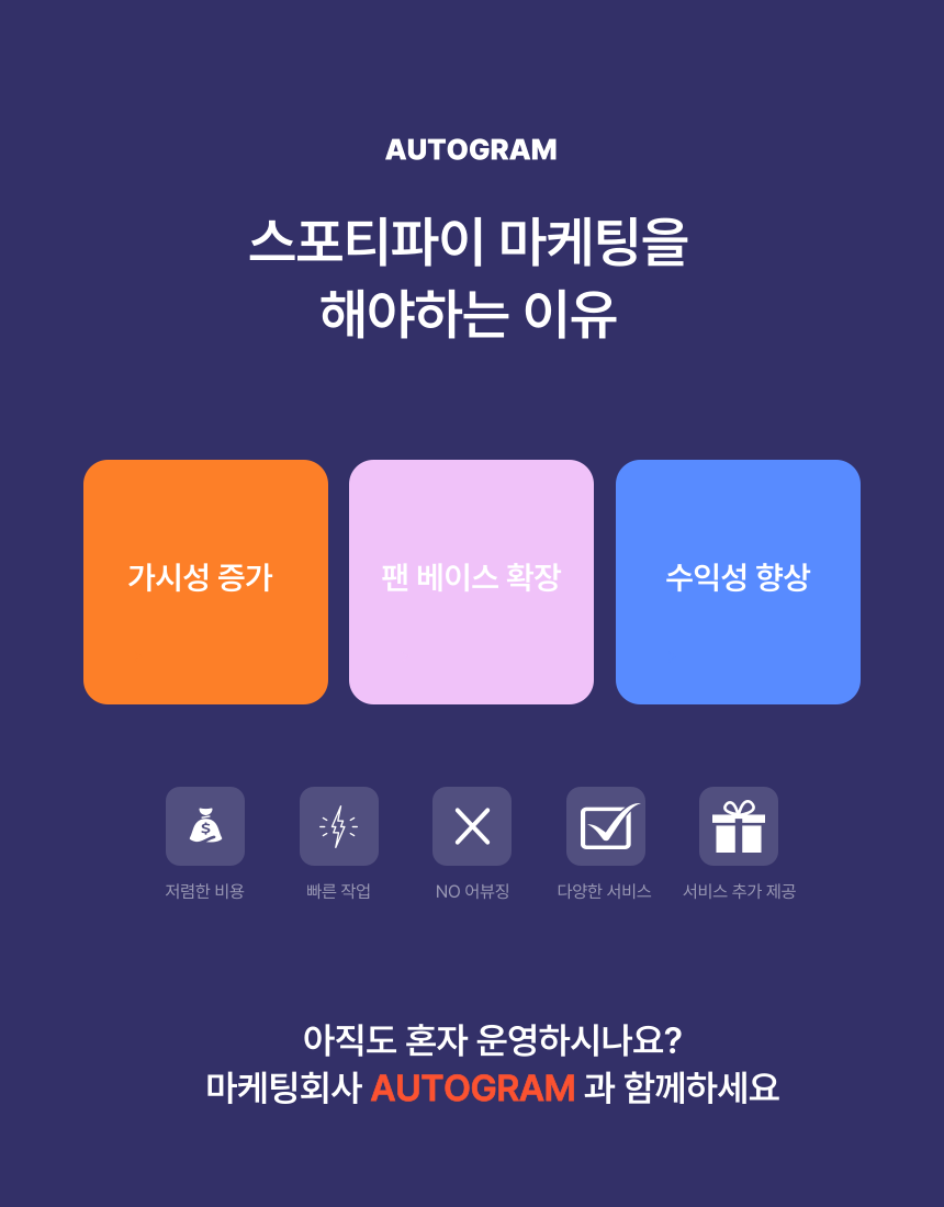 Autogram은 창의적이고 혁신적인 방법으로 스포티파이 계정의 가시성을 높이고, 장기적인 성공을 위한 기반을 마련합니다.