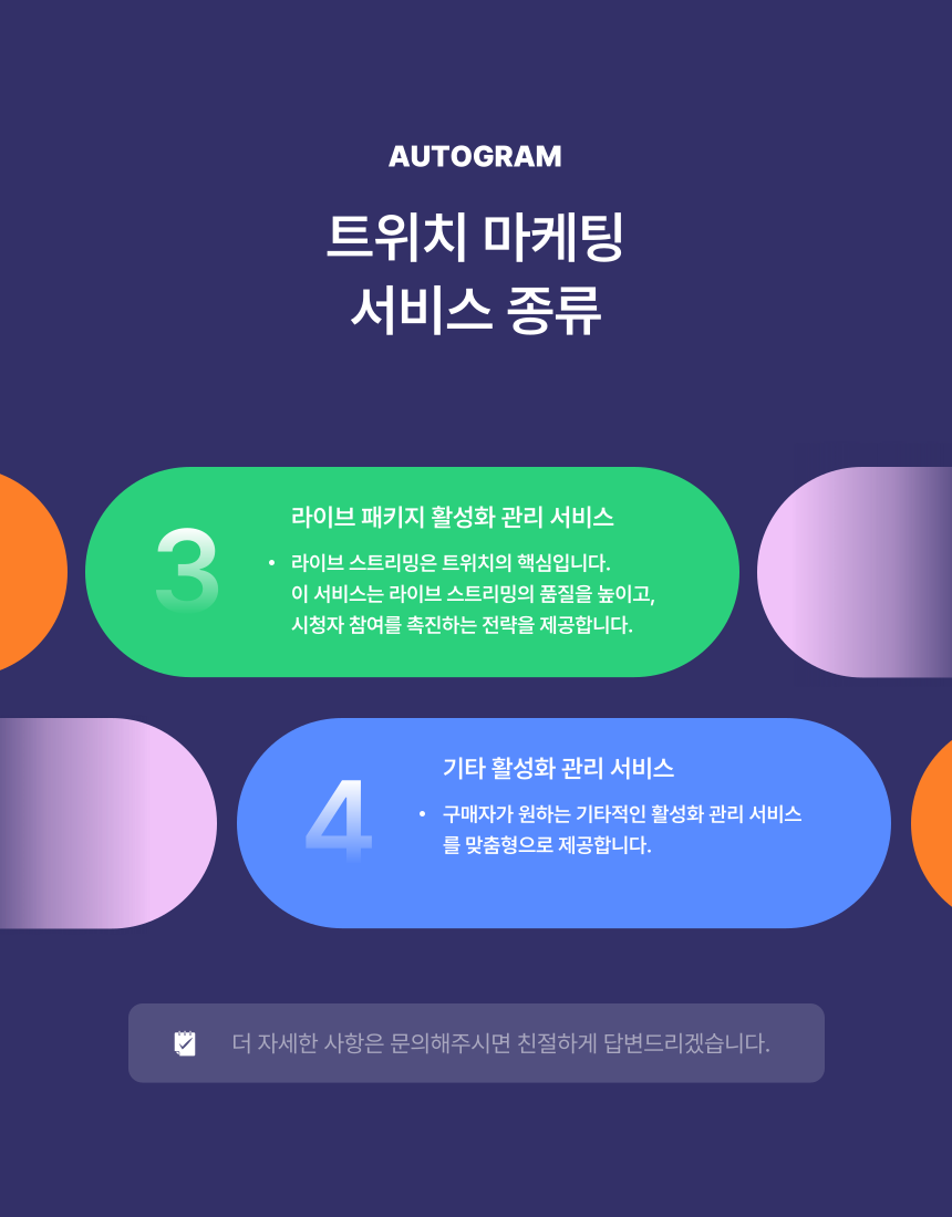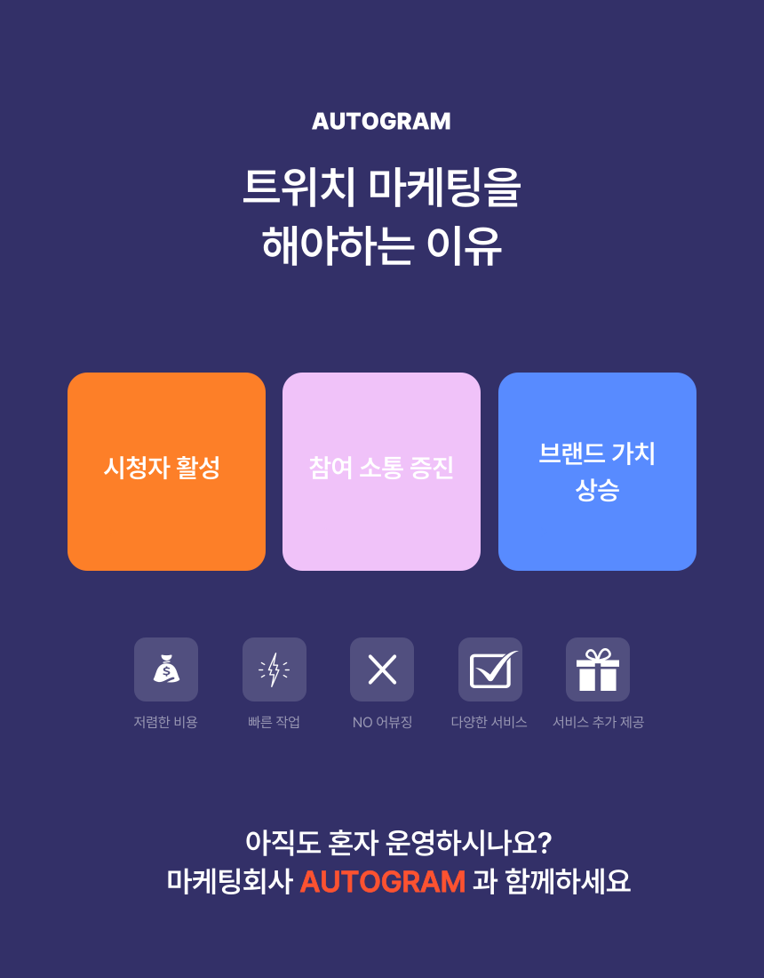 보다 넓은 시청자층에 도달할 수 있도록 도와줍니다. Autogram과 함께라면 트위치에서의 성공적인 여정을 시작할 수 있습니다.