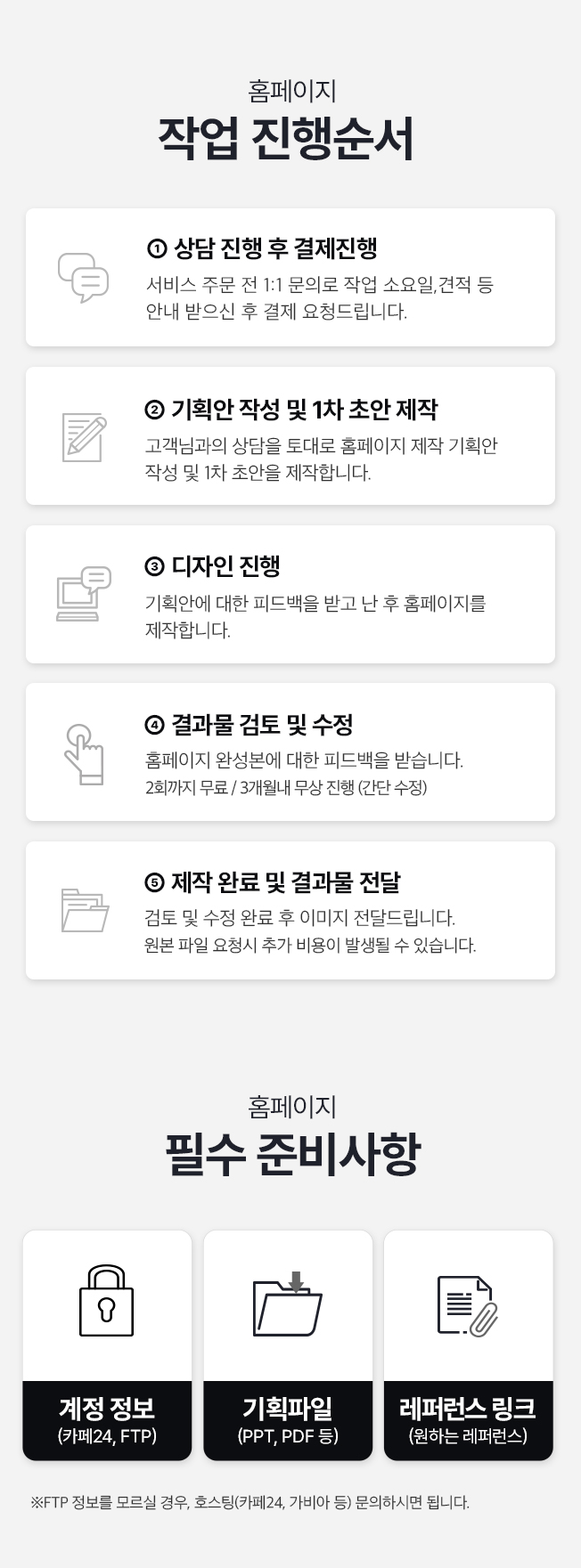 빠른 진행을 원하실 경우 (레퍼런스 링크/회사 로고파일/도메인)을 준비하셔서 문의주시면 고객님의 일정에 최대한 맞추어 진행해드리겠습니다.