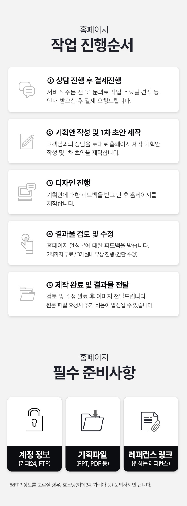 빠른 진행을 원하실 경우 (레퍼런스 링크/회사 로고파일/도메인)을 준비하셔서 문의주시면 고객님의 일정에 최대한 맞추어 진행해드리겠습니다.