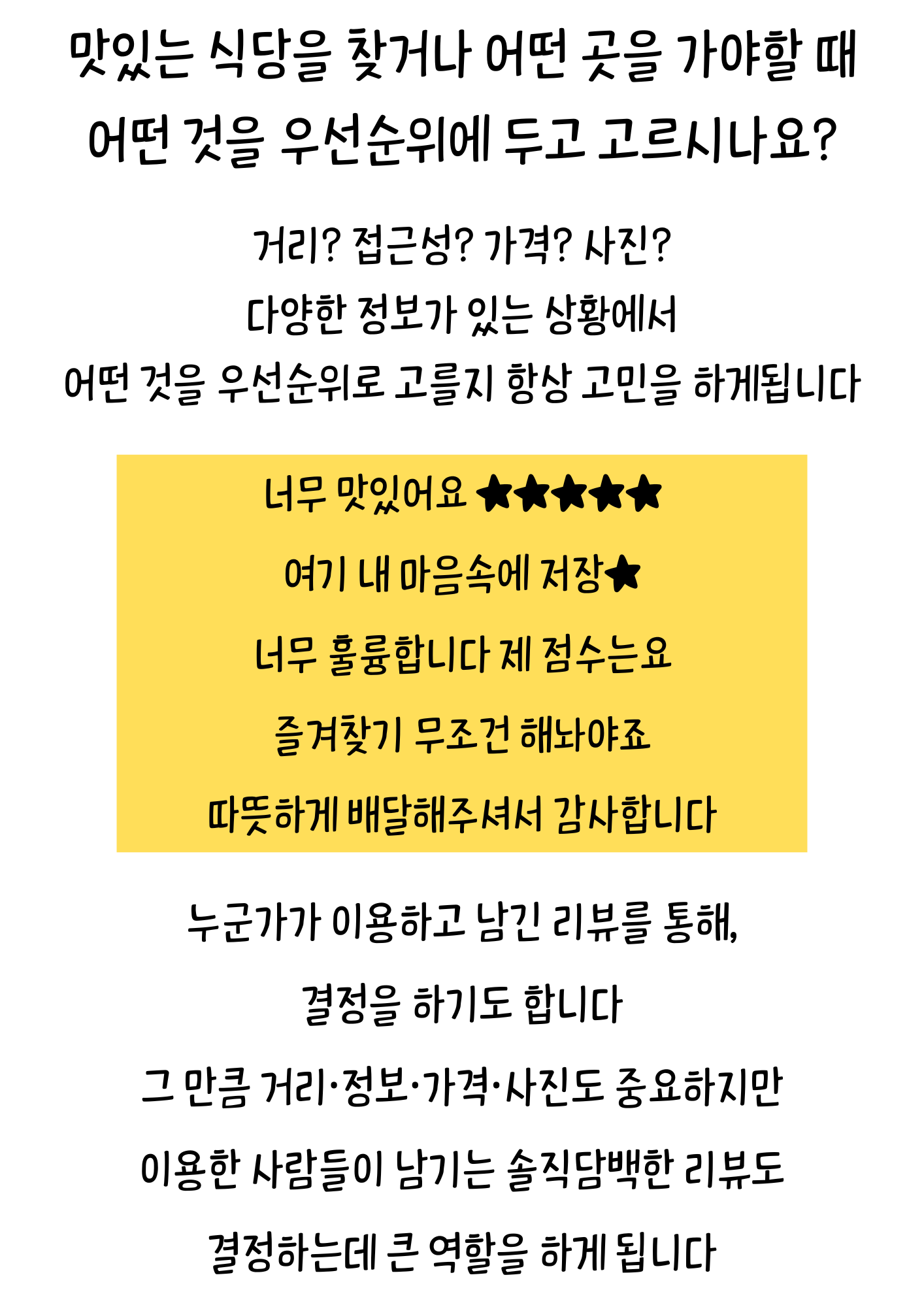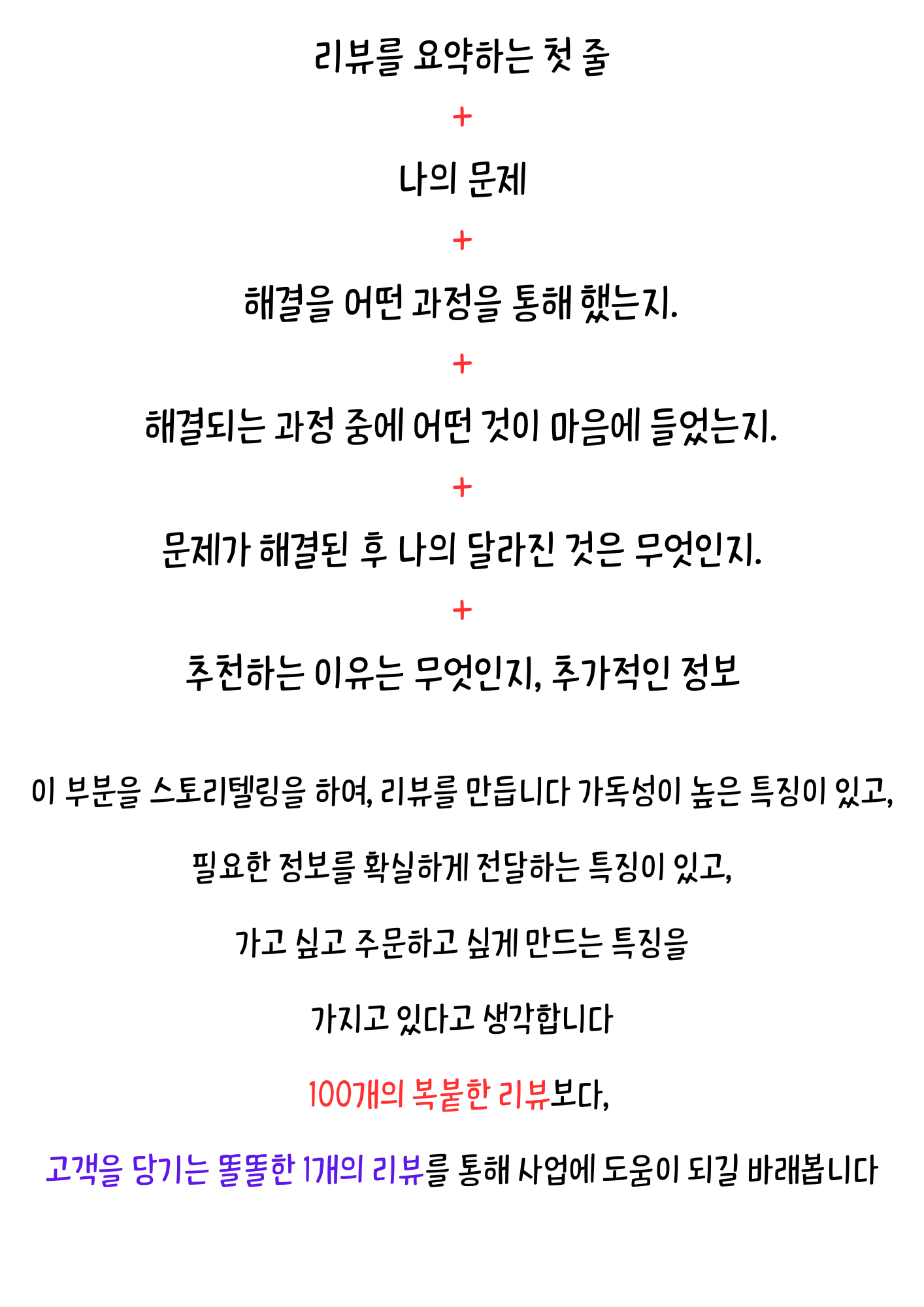 100개의 복붙한 리뷰보다, 고객을 당기는 똘똘한 1개의 리뷰를 통해 사업에 도움이 되길 바래봅니다