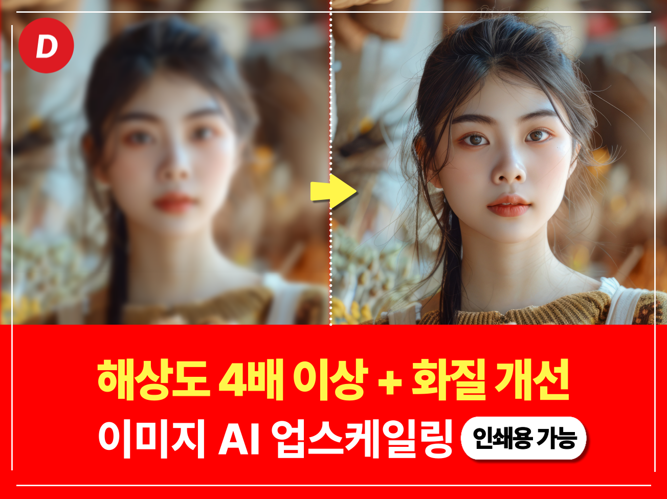 A. 네, 인공지능(AI) 기술을 활용하여 사진의 해상도와 화질을 동시에 개선합니다. 일반적으로 원본 픽셀의 4배로 확대해드리며, 원하시면 그 이상이나 인쇄용 고화질 이미지로도 제작이 가능하지만 비용이 다릅니다. 다만 화질이 낮아 육안으로도 이미지 내 개체가 잘 인식되지 않는 경우는 큰 개선이 어렵습니다.
