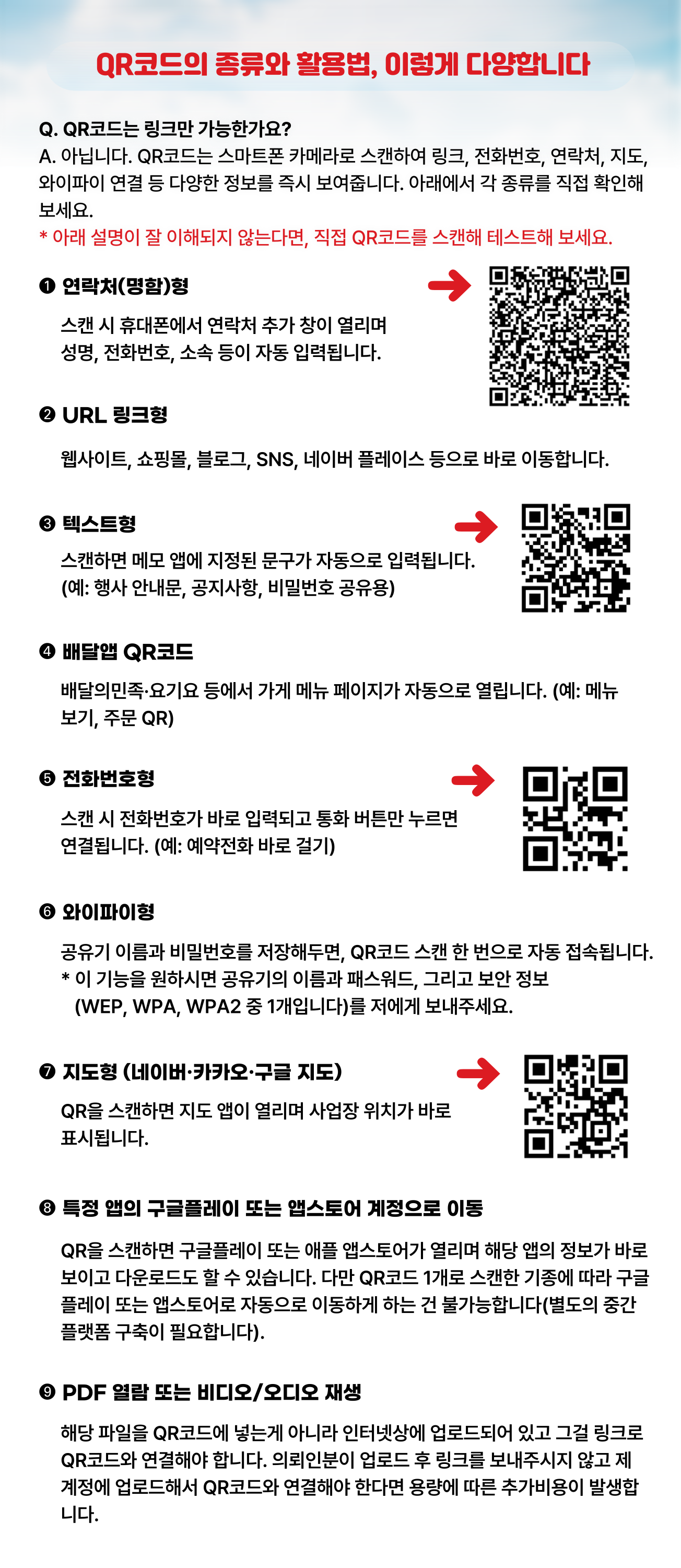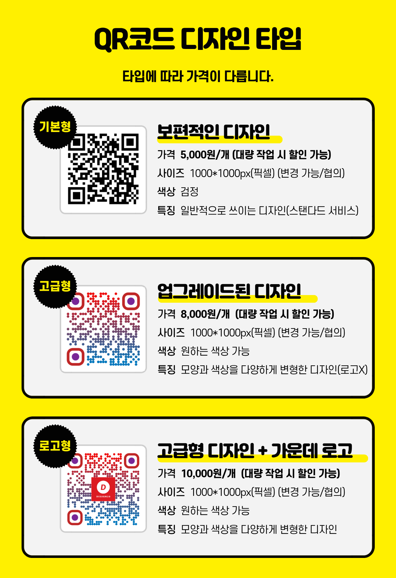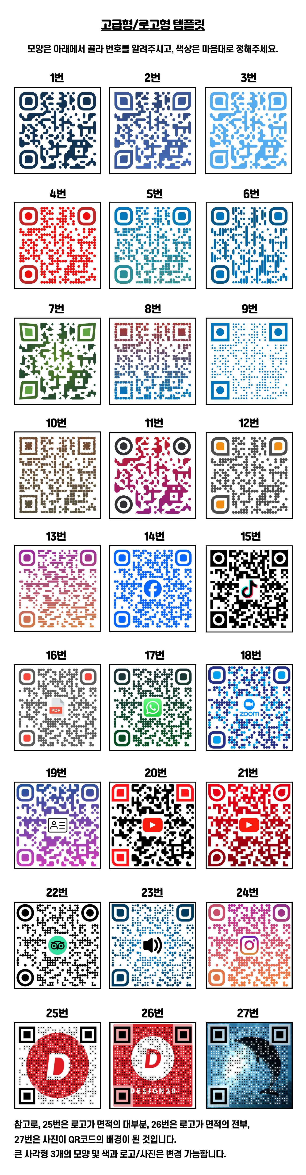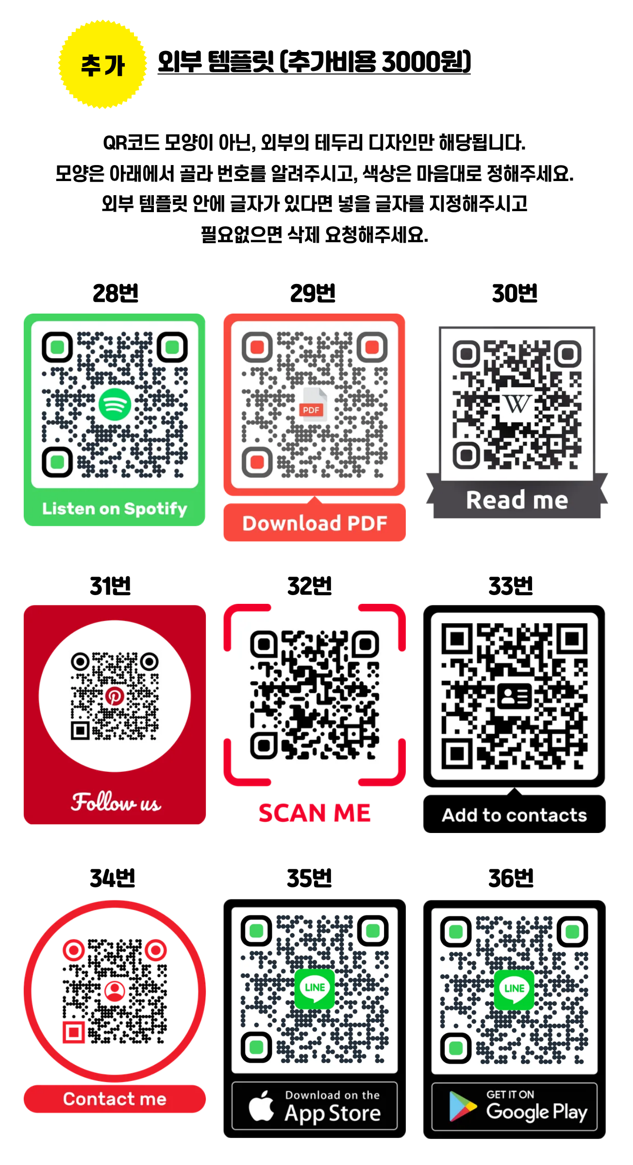 - QR코드 스캔 시 특정 웹페이지로 이동하는 방식 외에도 다양한 방식의 QR코드 제작이 가능합니다. 자세한 내용은 상세이미지를 참고 바랍니다.
