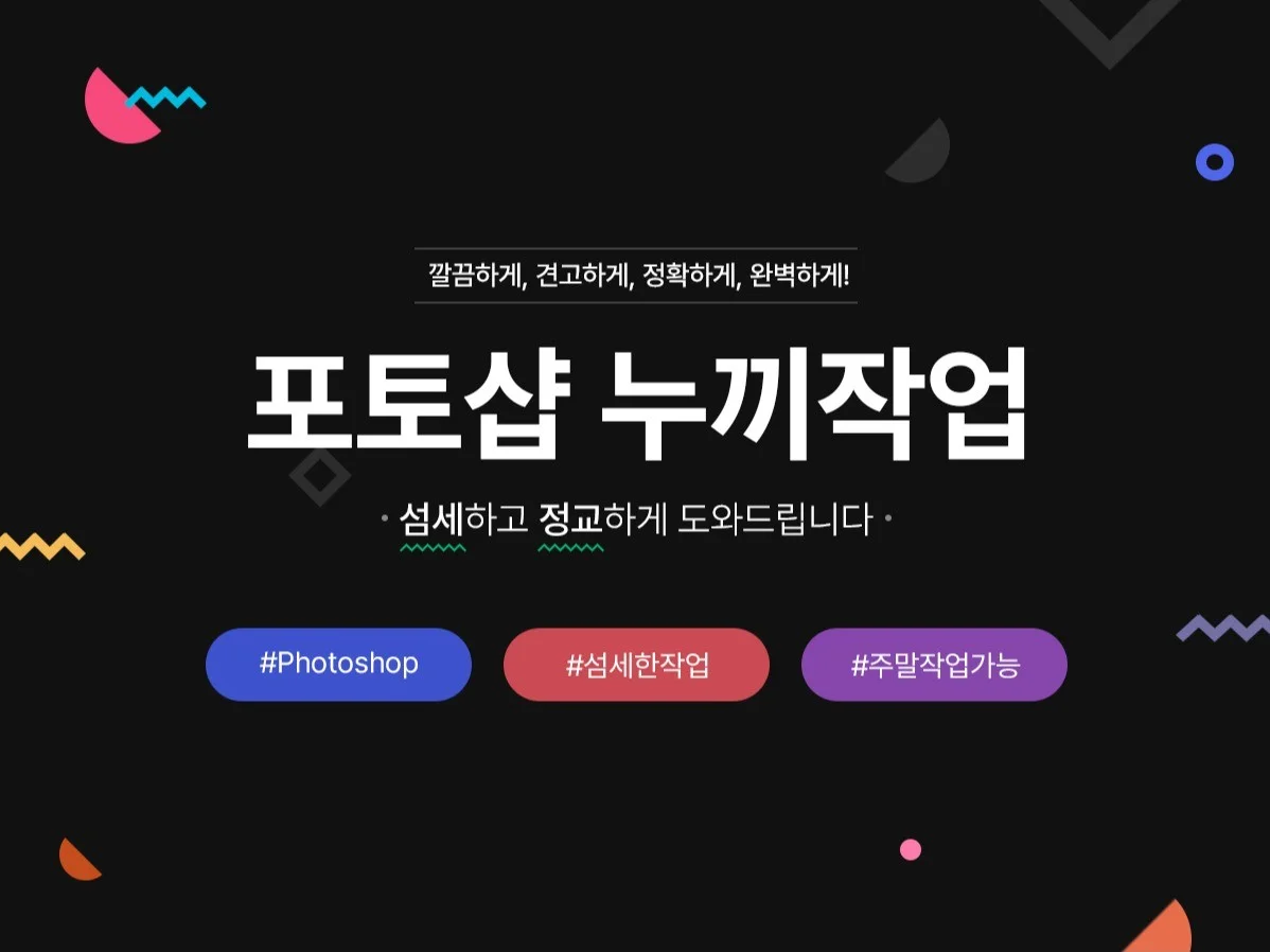 정확하고 꼼꼼한 누끼작업과 이미지 편집을 통해 만족스러운 작업을 도와드리고 있습니다.