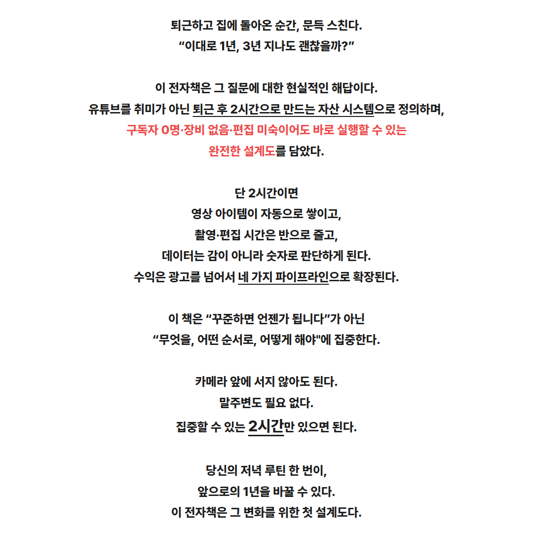 유튜브를 취미가 아닌 퇴근 후 2시간으로 만드는 자산 시스템으로 정의하며,