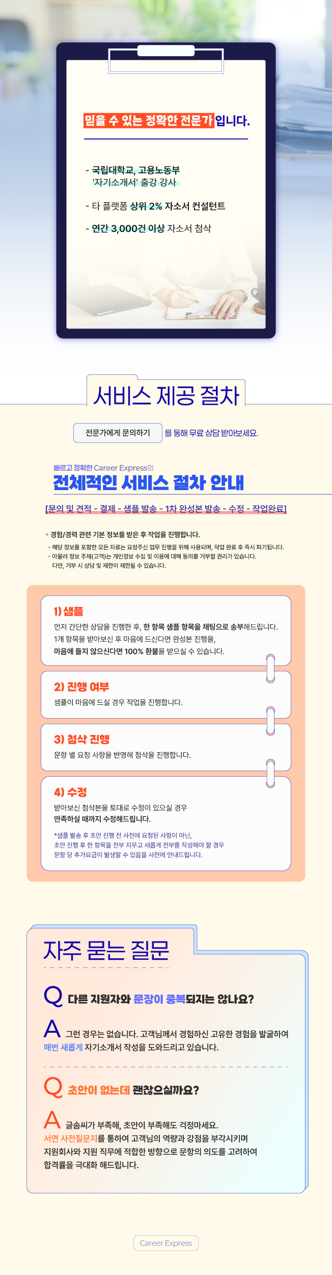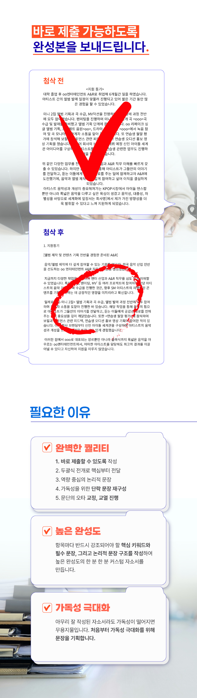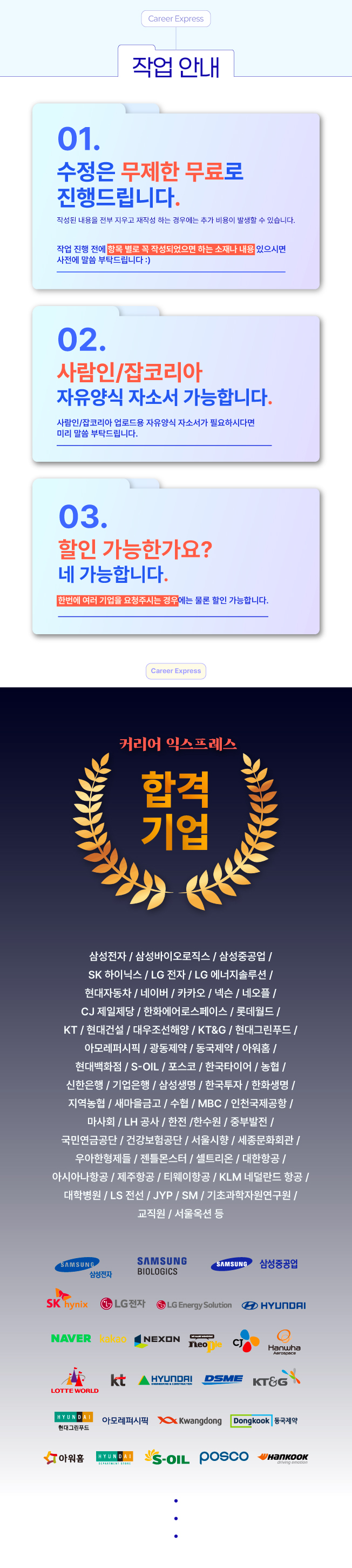 2) 촉박한 일정에도 퀄리티랑 납기까지 정확히 지켜주셔서 대기업 서류 한 번에 통과했습니다.