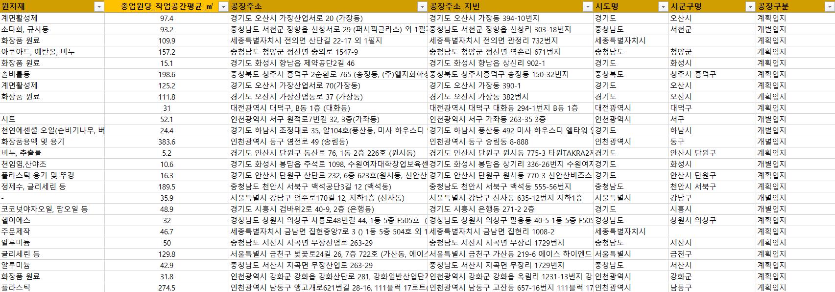 - 공장주소, 공장주소_지번, 시도명, 시군구명, 공장구분, 단지명, 용도지역, 지목, 지식산업센터명, 차수, 필지수