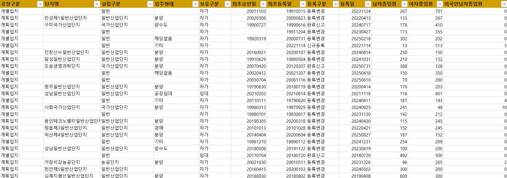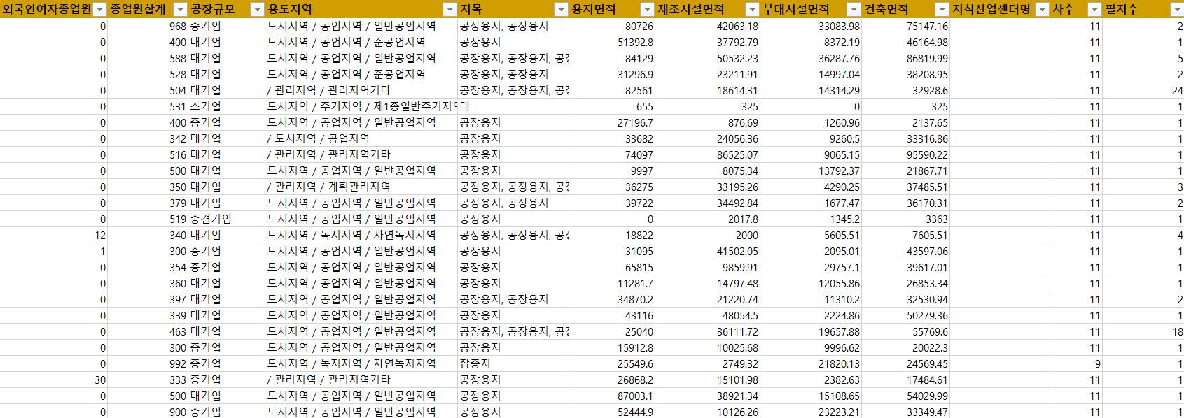- 공장주소, 공장주소_지번, 시도명, 시군구명, 공장구분, 단지명, 용도지역, 지목, 지식산업센터명, 차수, 필지수