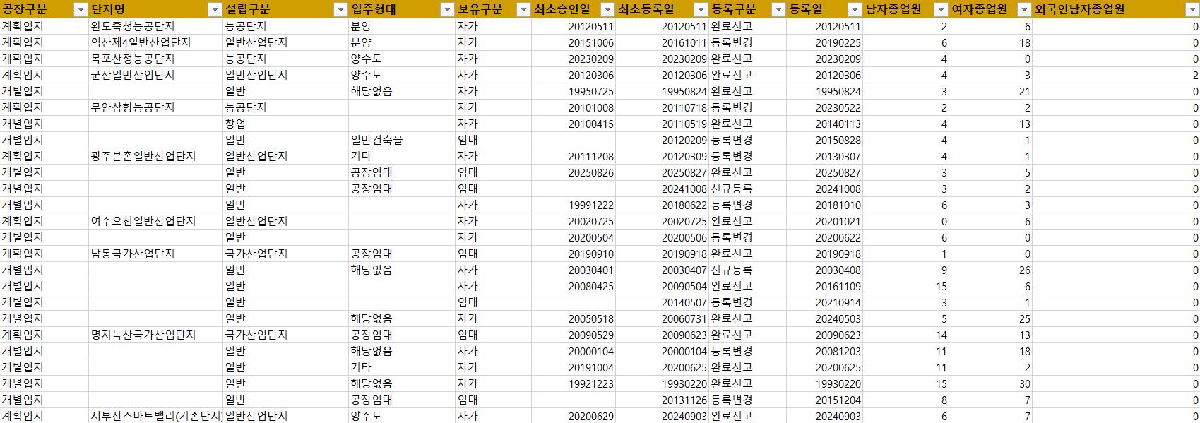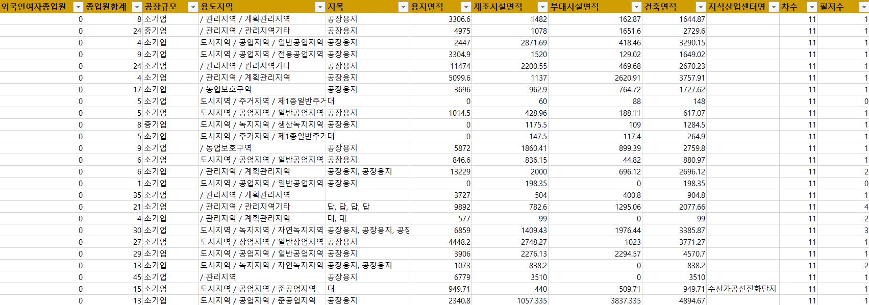 - 공장주소, 공장주소_지번, 시도명, 시군구명, 공장구분, 단지명, 용도지역, 지목, 지식산업센터명, 차수, 필지수