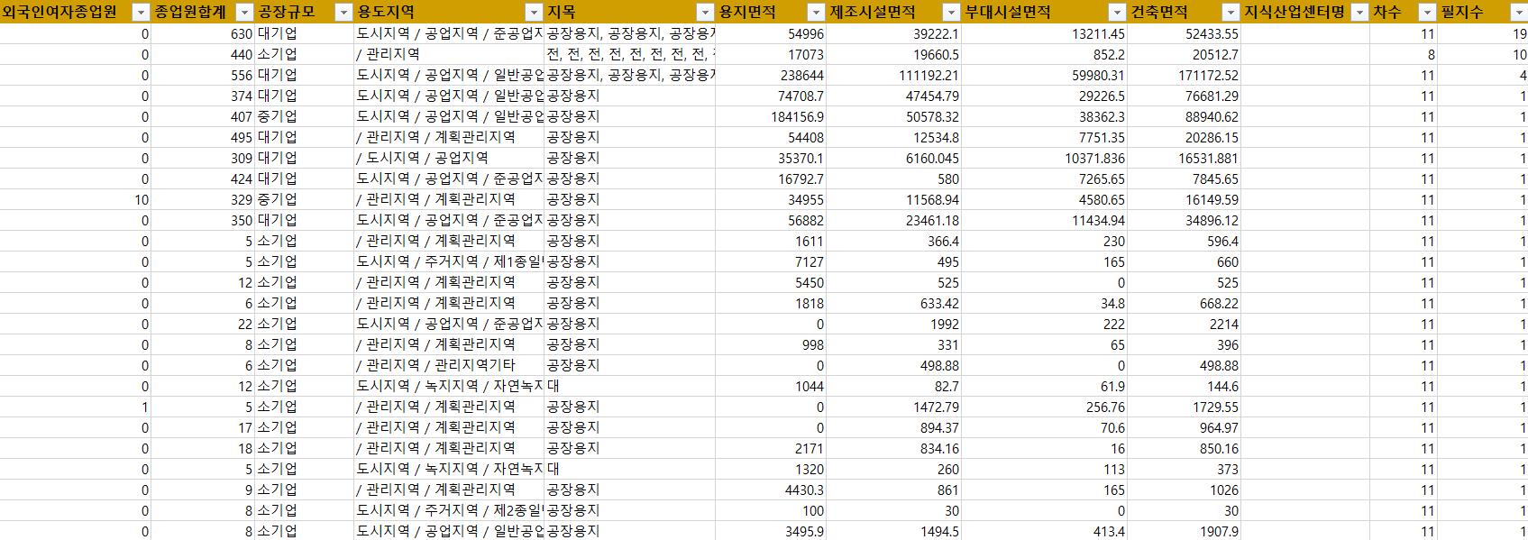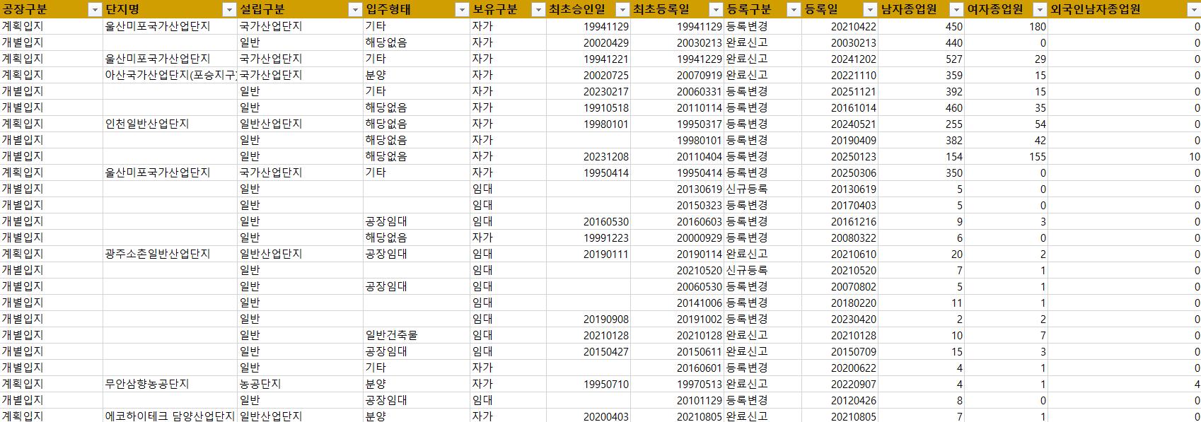 - 공장주소, 공장주소_지번, 시도명, 시군구명, 공장구분, 단지명, 용도지역, 지목, 지식산업센터명, 차수, 필지수