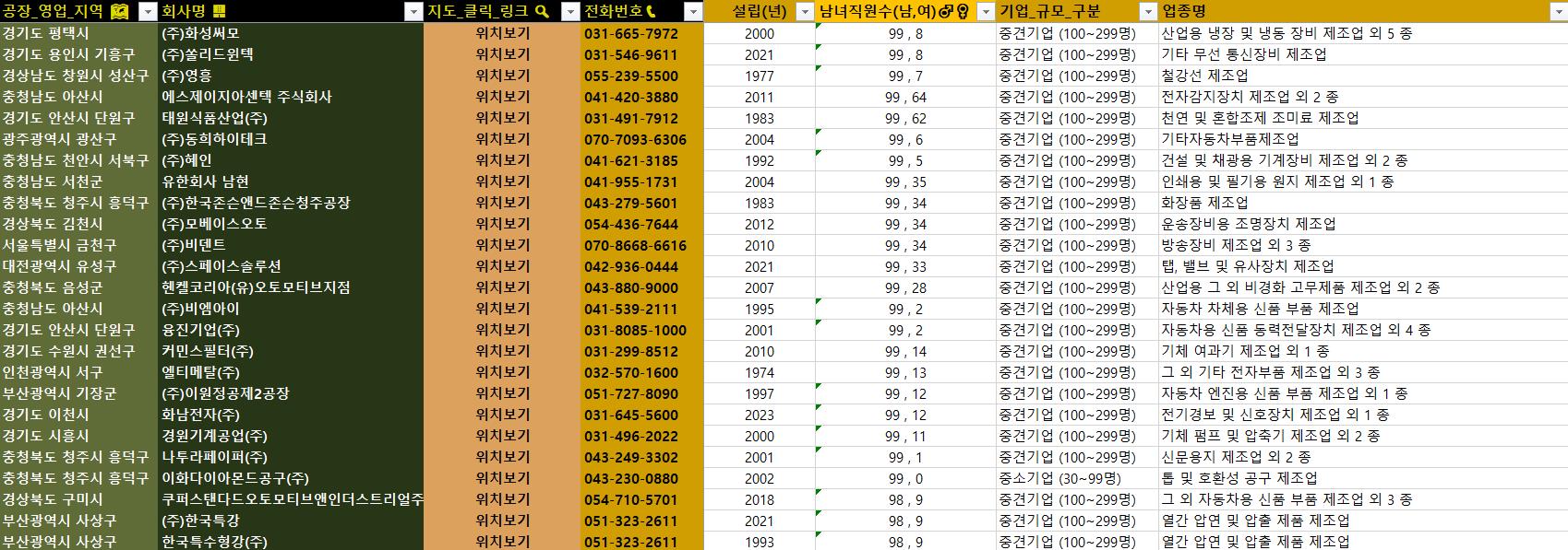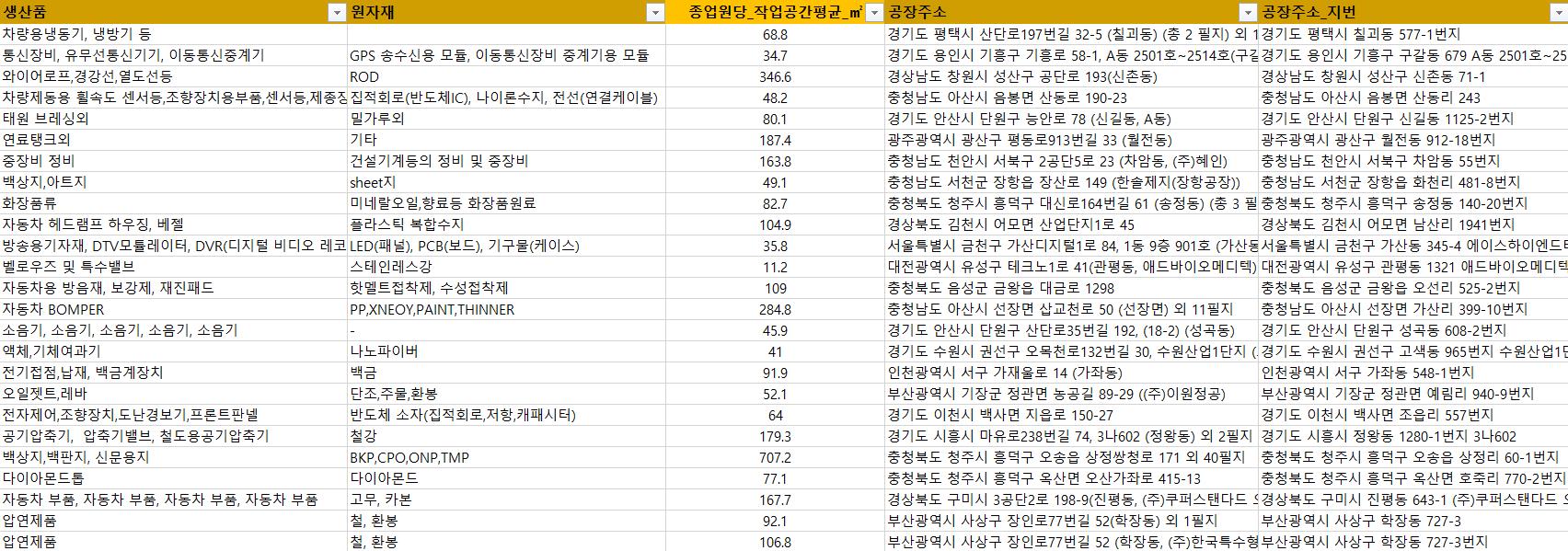 - 회사명 �, 전화번호�, 업종명, 생산품, 설립(년), 공장주소, 공장주소_지번, 시도명, 시군구명