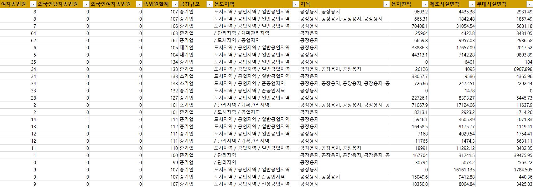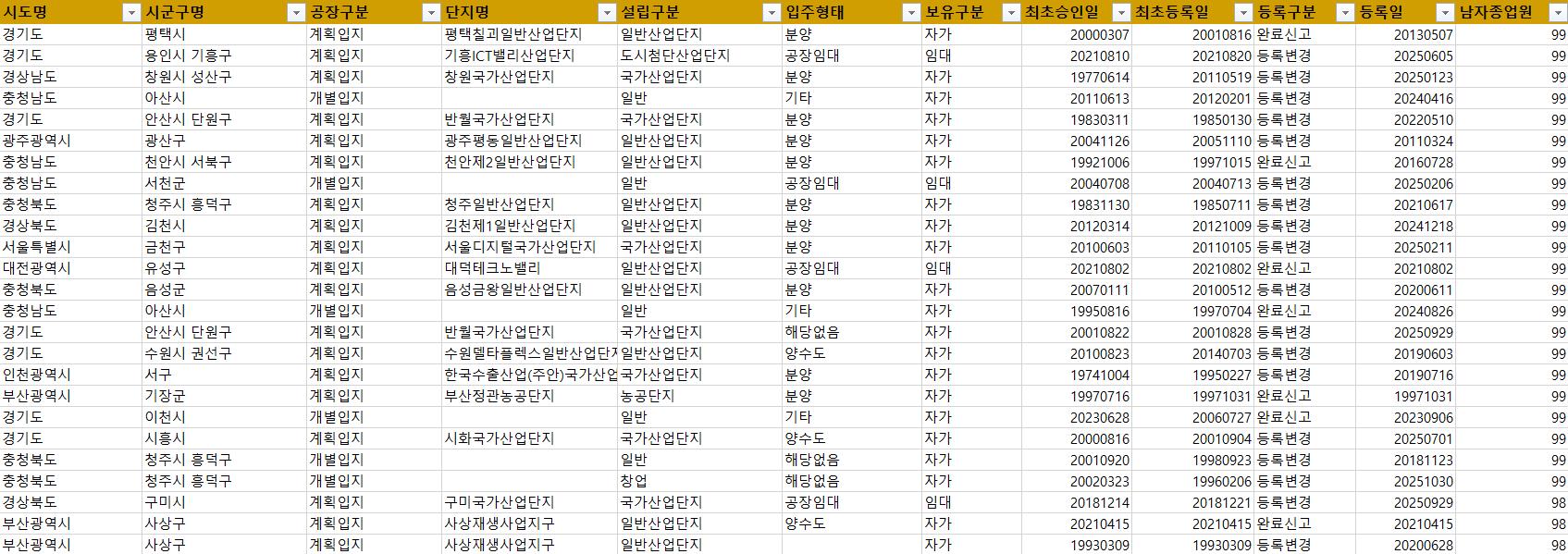 - 공장구분, 단지명, 설립구분, 입주형태, 보유구분, 공장규모, 용도지역,
