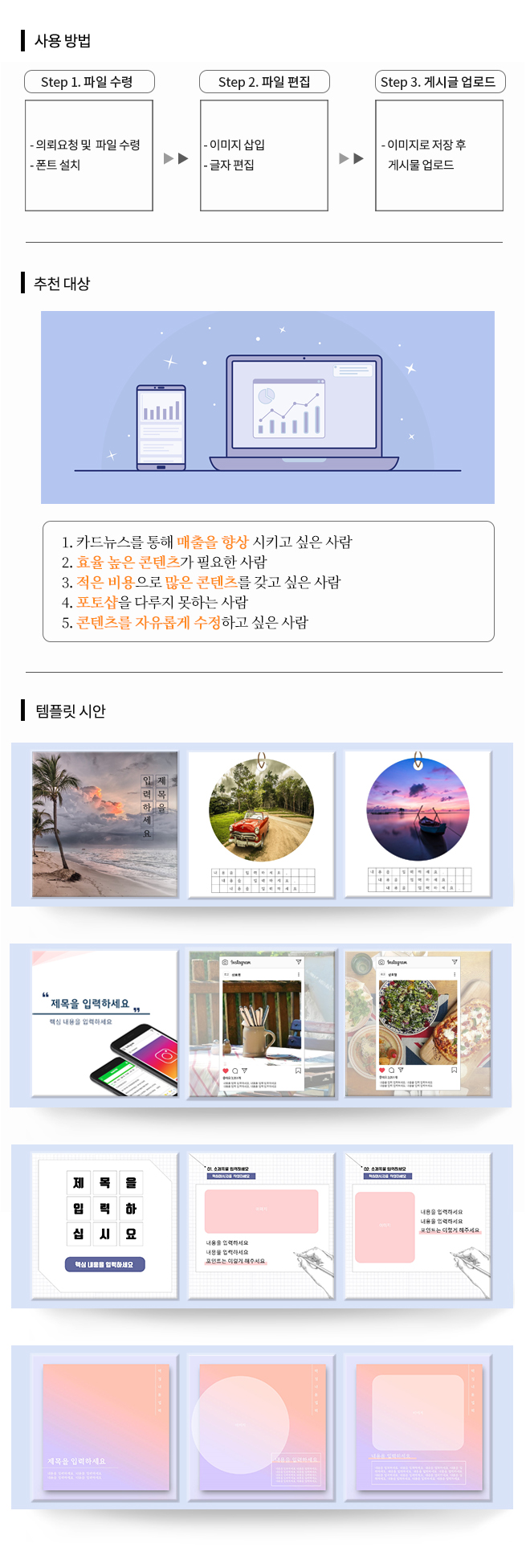 이에 도달수와 댓글, 좋아요 등 반응이 좋았던 카드뉴스를 선별해 누구나 쉽게 편집할 수 있도록 템플릿을 만들었습니다.